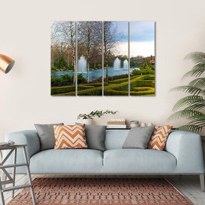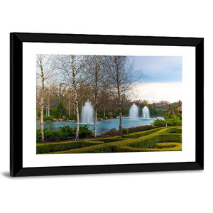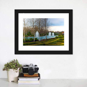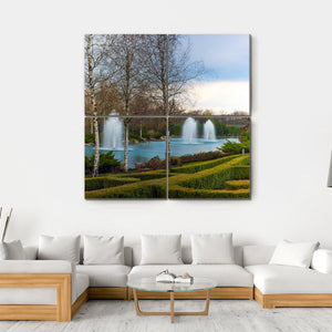 This landscape artwork captures serene fountains amidst tranquil ponds, trees, and manicured hedges. The realistic depiction showcases geometric patterns and natural hues of blue, green, and brown, making it an inviting addition to any space.