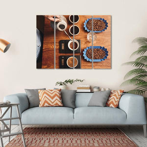 Embrace the art of coffee preparation with this canvas wall art featuring an overhead view of coffee beans and tools. The warm, precise atmosphere invites a sense of crafting and focus, making it an ideal piece for your kitchen or café-inspired space.