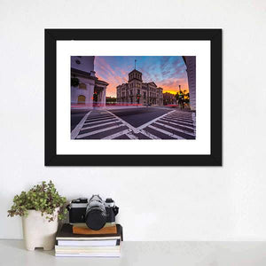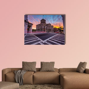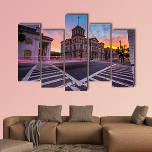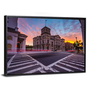 Four Corners In Charleston Canvas captures a low-angle, fisheye view of Charleston buildings, an intersection and a crosswalk beneath a striking sunset sky. Blue, orange and gray tones with streaking car light trails deliver a vibrant, dramatic energy that suits modern living rooms or offices.