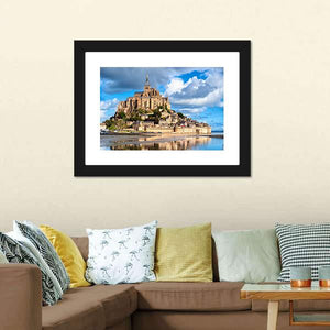 This canvas art captures the majestic beauty of Mont Saint-Michel, featuring its historic abbey and castle rising above serene waters under a blue sky dotted with cumulus clouds. Its realistic portrayal invites a sense of calm, making it a wonderful addition to any space.