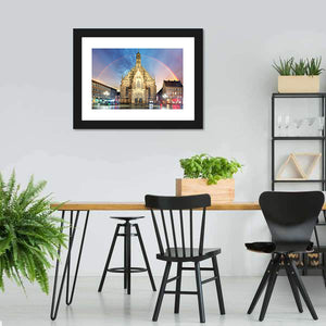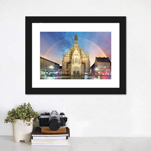 Experience the stunning Frauenkirche Church in this four-panel artwork, set against a vibrant rainbow. The dramatic cityscape showcases intricate architectural details and a reflective, wet cobblestone ground, creating an awe-inspiring atmosphere.