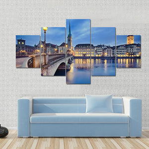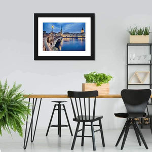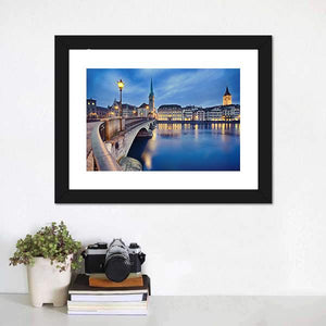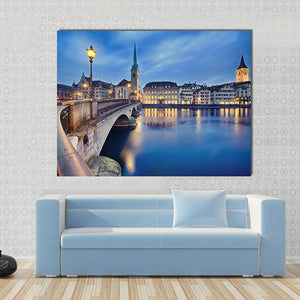 This canvas art captures the tranquil beauty of the Fraumunster Church at night, with its gothic-style spire and charming street lamps. The reflections on the flowing river add to the serene urban atmosphere, making it an inviting addition to your decor.