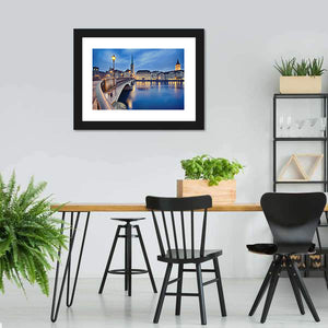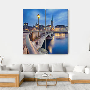 This peaceful canvas captures the Fraumunster Church in Switzerland at twilight, surrounded by city buildings, a river, and a bridge. With serene reflections on the water and softly illuminated windows, it brings a tranquil ambiance to any space.