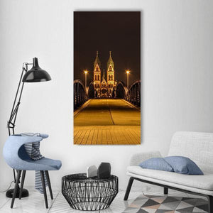 A dramatic, mysterious cityscape of Freiburg at night featuring a bridge, church spires and towers lit in yellow and orange. The photographic composition uses symmetry, depth and leading lines—cobblestone paths and streetlights pull the eye into an awe-inspiring architectural scene suited to modern room decor.