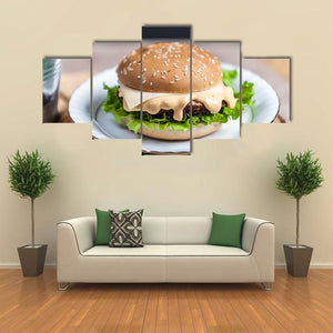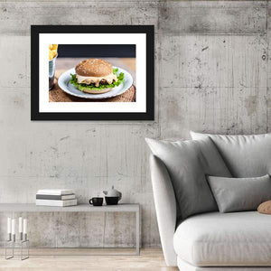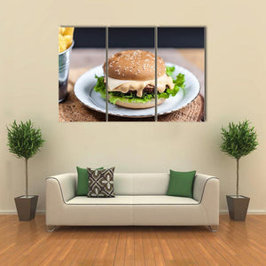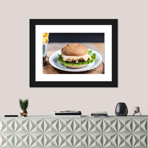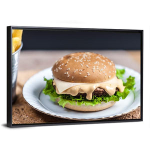 Tasty Burger Canvas Wall Art features a close-up hamburger with melted cheese, sesame seed bun, lettuce and a metal bucket of fries in a realistic food-photography style. The rule-of-thirds composition and brown, green, yellow and white palette create an appetizing, casual mood that fits kitchens, dining areas or relaxed restaurants.