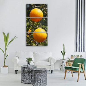 A close-up botanical print showing two oranges hanging on a branch, rendered in orange, green, and brown tones. Its fresh, vibrant, natural mood works well in kitchens, dining areas, or modern nature-inspired rooms.
