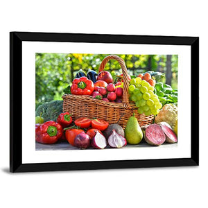 This vibrant canvas features an overflowing wicker basket of fresh vegetables and fruits, including grapes, bell peppers, and tomatoes. The realistic detail and bountiful composition create a lively atmosphere, making it an excellent choice for nature lovers.