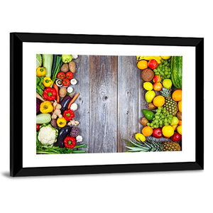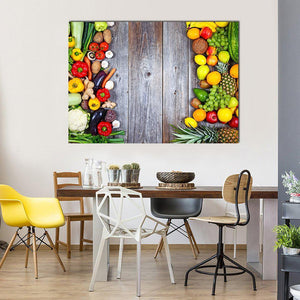 Bring the vibrancy of fresh fruits and vegetables into your space with this stunning canvas wall art. Featuring a rich palette of greens, reds, yellows, and oranges against a rustic wooden background, it captures a healthy, lively atmosphere that enhances any room.