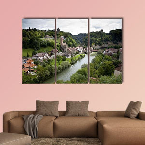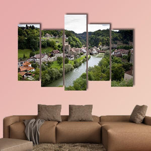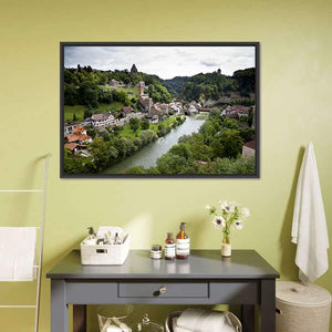 Fribourg City Switzerland Canvas Wall Art depicts a picturesque riverside town with clustered buildings, a bridge and a castle tower framed by lush green trees and rolling hills. Rendered with an aerial perspective that emphasizes depth, it conveys a serene, historic mood suited to modern or nature-inspired interiors.