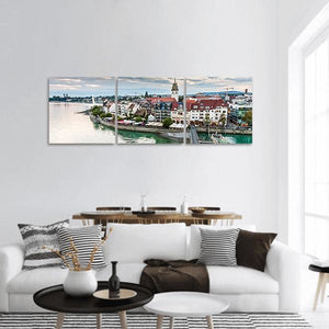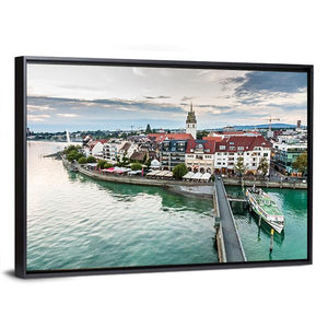 A realistic panoramic view of Friedrichshafen, Germany, capturing the lakeside town with waterfront buildings, a bridge, red rooftops, a church steeple and boats on the water. Daytime summer colors—blues, greens, whites and hints of red—create a peaceful, serene yet vibrant atmosphere. Suitable for modern living rooms or home offices that favor nature-inspired wall decor.