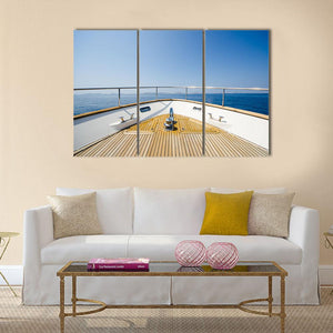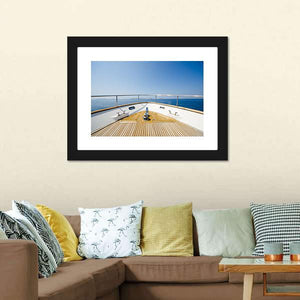 This artwork features a serene boat deck overlooking a calm ocean under a clear sky. The tranquil scene, captured from a low angle, invites a sense of peace and relaxation, making it a wonderful addition to any coastal or nautical-themed decor.