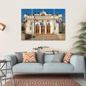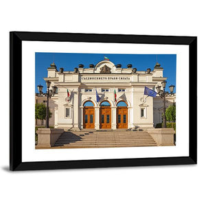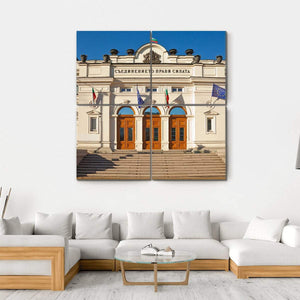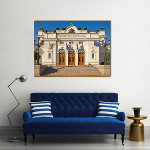 This canvas art showcases the striking facade of the Bulgarian Parliament, framed by the vibrant colors of national flags. The artwork exudes an official atmosphere, with a focus on symmetry and architectural details that make it a standout piece.