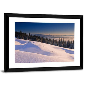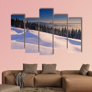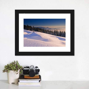 Snowy hills and layered mountains rise behind stands of pine trees, with sunlight catching on the snow to create a serene, cold, and majestic winter scene. Rendered in a realistic nature style, this canvas works well in modern or nature-inspired home spaces like living rooms and bedrooms.