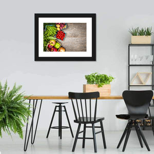 This vibrant canvas features a rich arrangement of fresh fruits and vegetables, including potatoes, tomatoes, and apples, set against a rustic wooden background. The overhead view and lively colors evoke a sense of freshness and health, making it a delightful addition to your kitchen or dining area.