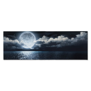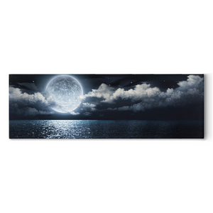 A full moon hangs over a calm night sea, with moonlight reflecting across the water and stars scattered in the sky. The dramatic, realistic panorama feels serene and mysterious — a quiet piece for modern living rooms or bedrooms.