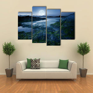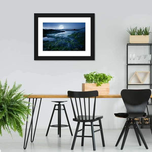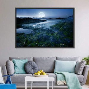 This landscape artwork showcases a tranquil moonlit ocean with striking rocks along the coastline. The serene blues and greens create a mysterious atmosphere, making it a wonderful addition to any coastal-themed décor.