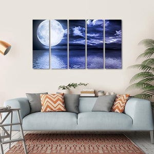 This canvas features a serene scene of a full moon reflected on calm ocean waters beneath a cloudy sky. The tranquil blue and black palette creates a mysterious atmosphere, making it a captivating addition to any modern decor.