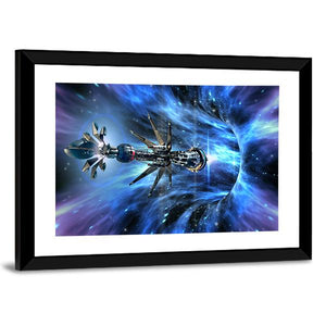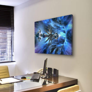 This striking canvas showcases a detailed spaceship navigating through a vibrant wormhole. With its cosmic blues and purples, it captures a futuristic and adventurous atmosphere, perfect for adding a sci-fi touch to your space.