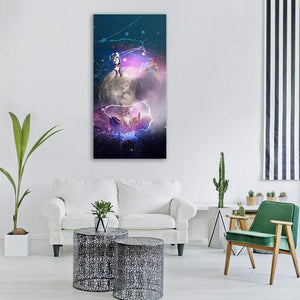 An astronaut in a space suit hovers above a glowing city skyline set against nebula-like clouds and a starry galaxy backdrop. The blue, purple and pink palette and abstract digital style give the piece a surreal, imaginative mood that works well with modern room decor.