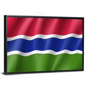 Featuring the Gambia flag, this canvas shows wavy red, blue and green stripes with white accents arranged using the rule of thirds. The modern, patriotic piece brings a symbolic touch to house room decor and modern spaces.