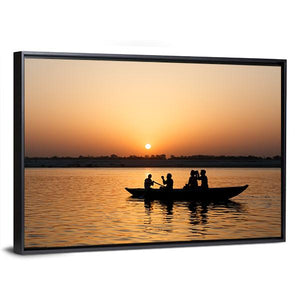 A silhouetted boat with people on the Ganges at sunset, painted in warm oranges, yellows and deep browns. The rule-of-thirds composition and simple silhouettes create a peaceful, golden-hour atmosphere that suits modern home and room decor.