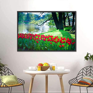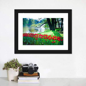 A realistic garden scene with a dense row of red tulips in the foreground, a tranquil lake, and trees set among grassy slopes. Composed with depth and the rule of thirds, the red, green, blue and brown palette feels vibrant yet serene and suits modern room decor.