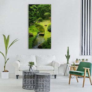 A peaceful zen garden scene with green trees, a meandering stream, manicured bushes, and mossy rocks. The realistic nature-photography look and tranquil, natural mood make it a calm focal point for modern or nature-inspired rooms like living rooms, bedrooms, or offices.