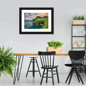 Mulafossur Waterfall Canvas Wall Art presents a wide, photorealistic coastal landscape: a cascading waterfall tumbling over craggy cliffs into a choppy ocean, with green hills and scattered white houses beneath a stormy sky. The scene reads dramatic yet serene, using greens, blues, greys, browns and whites to keep the mood natural. Suited to coastal or modern interiors, it works well as a nature-focused accent in living rooms, bedrooms, or home offices.
