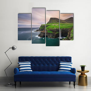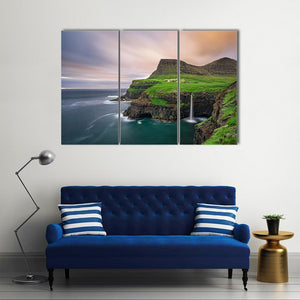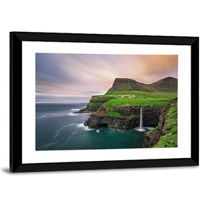 This canvas artwork captures the serene beauty of Gasadalur Village, featuring coastal cliffs, a majestic waterfall, and a vibrant village scene. Perfect for bringing a peaceful atmosphere to any space.