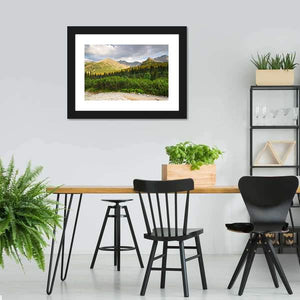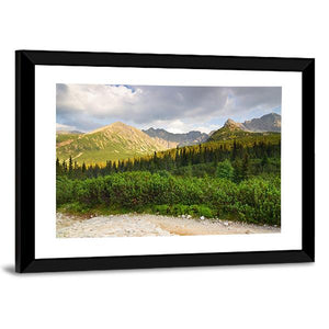 Gasienicowa Valley Canvas Wall Art shows a realistic landscape of sunlit mountain peaks, dense evergreen forest, and a rocky riverbed. The composition feels peaceful and naturally serene, with green and gray tones that suit modern room decor.