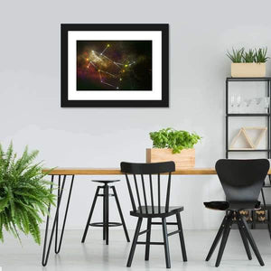 This canvas art features the Gemini constellation, beautifully illustrated with glowing lines connecting the stars. Its cosmic palette of dark blue, purple, and vibrant pops of orange and yellow evokes a mysterious and ethereal atmosphere, making it a striking addition to any modern decor.