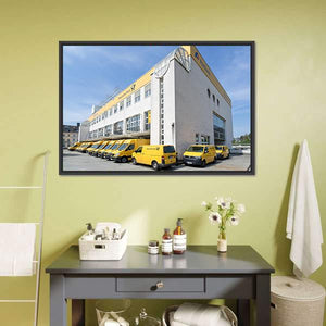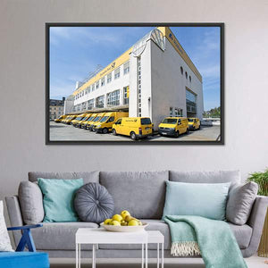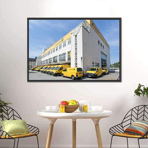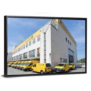 A photorealistic cityscape of a German logistics company, showing modern buildings and yellow postal vans arranged with strong perspective and rule-of-thirds composition. The image feels urban, commercial, and organized, and suits modern offices or home workspaces.