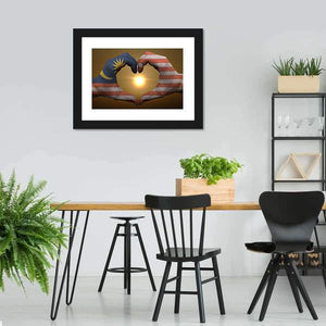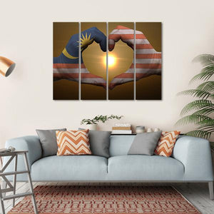 This striking artwork features hands forming a heart shape, with the Malaysian flag on one hand and the American flag on the other. The silhouette against a sunset creates a symbolic and patriotic atmosphere, perfect for expressing love and unity.