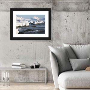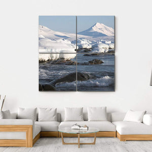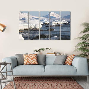 This canvas art captures the beauty of an icy coast with snow-covered mountains and ocean waves, reflecting a cold yet serene atmosphere. The powerful scene, featuring icicles and crashing waves, brings a touch of the Arctic into your space.