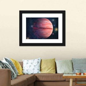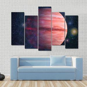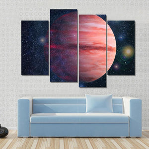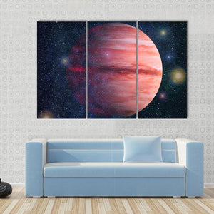 This captivating landscape artwork features a vibrant red gas planet surrounded by swirling clouds and distant stars. Its cosmic and mysterious vibe makes it an ideal decor piece for any modern space.