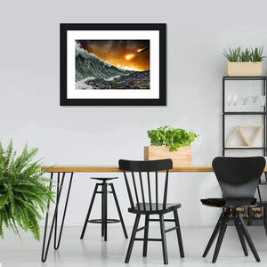 This captivating piece showcases a massive tsunami wave crashing into a city, creating an atmosphere of chaos and drama. The dynamic low-angle view, combined with fiery meteors and dark stormy clouds, evokes an apocalyptic mood, making it a striking addition to your art collection.