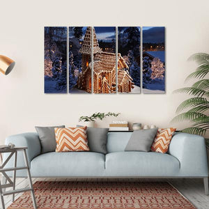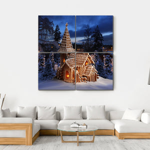 This enchanting canvas features a whimsical gingerbread church set against a snowy landscape. The warm glow of illuminated windows and twinkling lights creates a cozy, festive atmosphere perfect for holiday decorating.