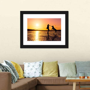 This canvas captures a joyful scene of a girl playing with her dog at the beach during a warm sunset. With silhouetted figures against a palette of orange and yellow, it evokes a sense of active warmth, making it a charming addition to any decor.