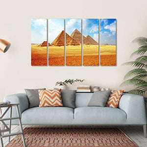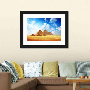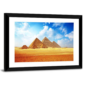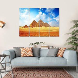 This photorealistic canvas art captures the grandeur of the pyramids set against a serene desert sky. Hues of orange and blue evoke an epic atmosphere, making it a striking addition to your wall decor.