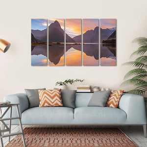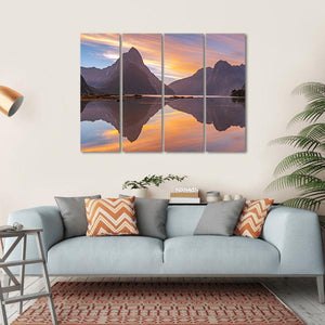 This canvas print features a serene landscape of Milford Sound in New Zealand, showcasing majestic mountains reflected in calm lake waters. The colorful sunset sky adds a tranquil vibe, making it an eye-catching piece for any nature lover.