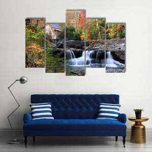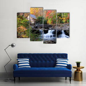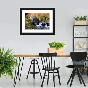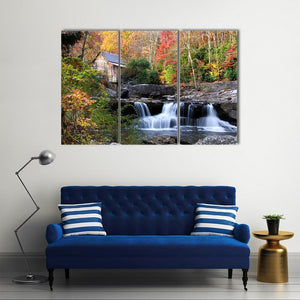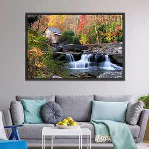 This canvas art captures a serene landscape featuring a wooden cabin, a multi-tiered waterfall, and vibrant autumn trees. The tranquil scene, with rich greens, reds, and browns, brings a rustic touch to any space.