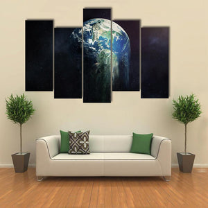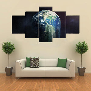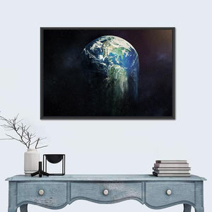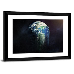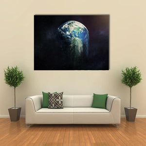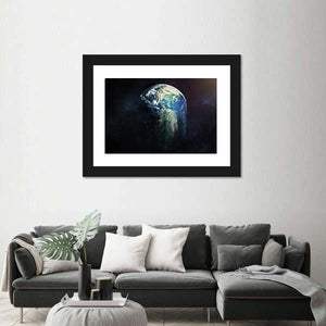This canvas art features a surreal depiction of a melting Earth set in outer space. The composition, filled with deep blues, greens, and starry blacks, evokes a concerning atmosphere that prompts reflection on our planet's future.
