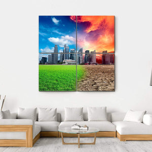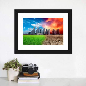 This canvas art captures the stark contrast of a city skyline, juxtaposing lush green grass and a bright blue sky with cracked dry earth and a fiery orange sky. The dramatic split composition invites reflection on the effects of climate change, making it a thought-provoking addition to any modern décor.