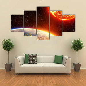 This stunning canvas artwork features a vibrant view of Earth illuminated by city lights, with the sun's corona glowing above. Its cosmic beauty and modern style make it a captivating addition to any wall.