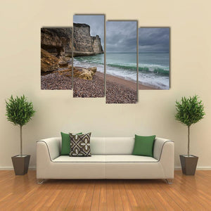 This stunning canvas captures the moody beauty of coastal cliffs, ocean waves, and a pebble beach. Its dramatic palette of grays, blues, and browns evokes a serene, contemplative atmosphere, making it an ideal addition to any nature-themed decor.