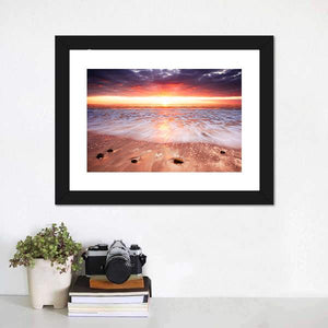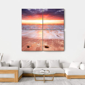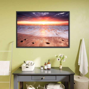 This canvas features a serene view of ocean waves meeting the beach at sunset. The vibrant palette of orange, purple, and tan captures the natural beauty of the scene, creating a calming atmosphere for any room.