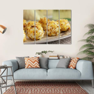 This canvas art features appetizing goat cheese balls coated in nuts, captured in a close-up, inviting presentation. With its rustic vibe and warm palette of whites, tans, and browns, it brings a homemade feel to any space.