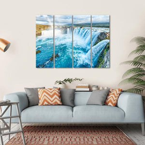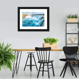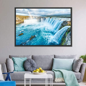 Experience the majestic beauty of Godafoss Waterfall with this stunning canvas print. Featuring vibrant hues of blue and green, accented by a sunbeam creating a rainbow, this artwork captures a serene and powerful moment in nature.