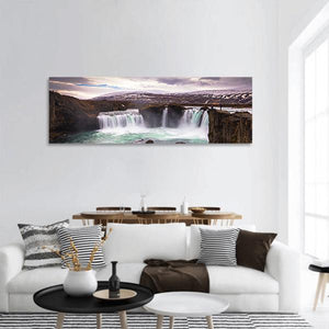 A wide panoramic canvas of Godafoss waterfall in Iceland, showing snow-capped mountains, rocky cliffs and a lone figure on a cliff edge. The naturalistic scene carries a powerful, awe-inspiring yet serene mood. It fits modern or nature-inspired rooms as understated wall decor.