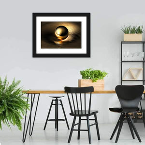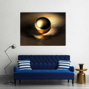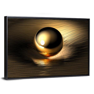 A centered golden sphere with a highly reflective surface and swirling lines sits against a textured background. This abstract metallic canvas reads bold and luxurious and pairs well with modern home or room decor.